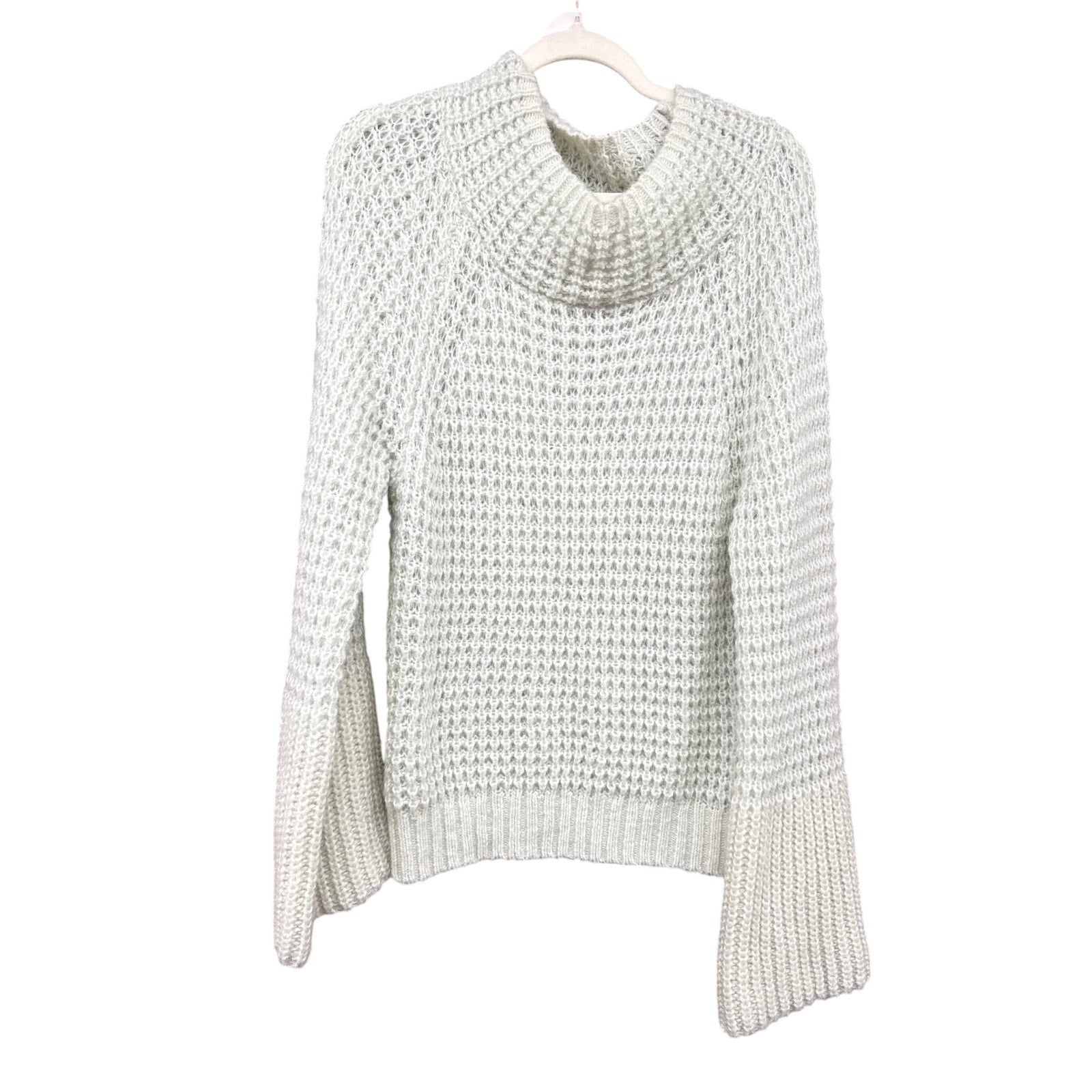 Anthropologie Maeve Wool Blend Dionne Bell Sleeve Sweater in a refreshing mint color. This stylish sweater features unique trumpet sleeves that add a touch of elegance to your outfit. The wool blend material offers both warmth and comfort, with a hint of stretch for a perfect fit. It's a versatile piece that can be dressed up or down for any occasion. Super soft and stretchy - cowl neck, turtleneck