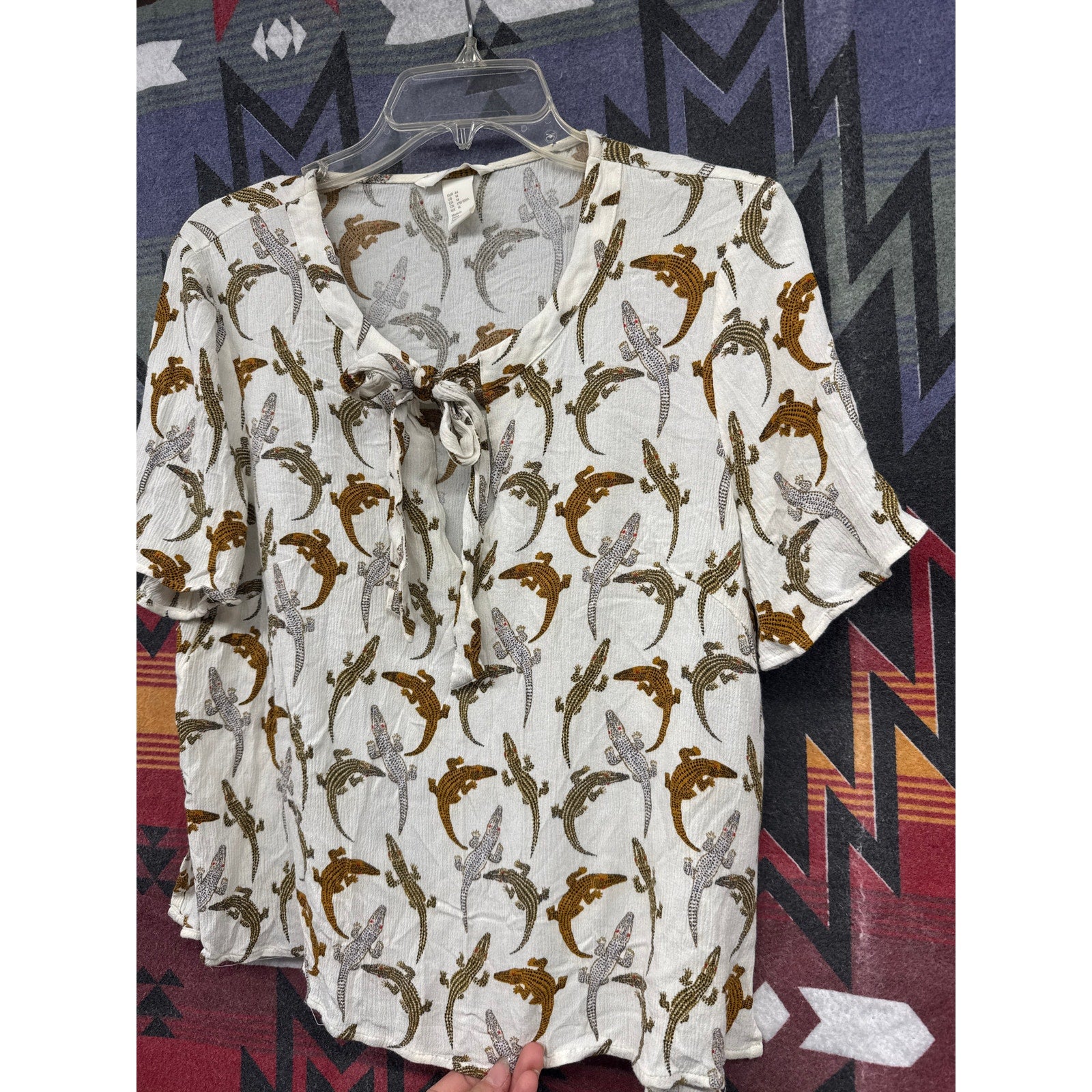 Charming H&M blouse featuring a delightful alligator novelty print! This quirky and artful piece adds a touch of twee style to your wardrobe. Perfect for those who appreciate unique and eye-catching designs. Size 14.