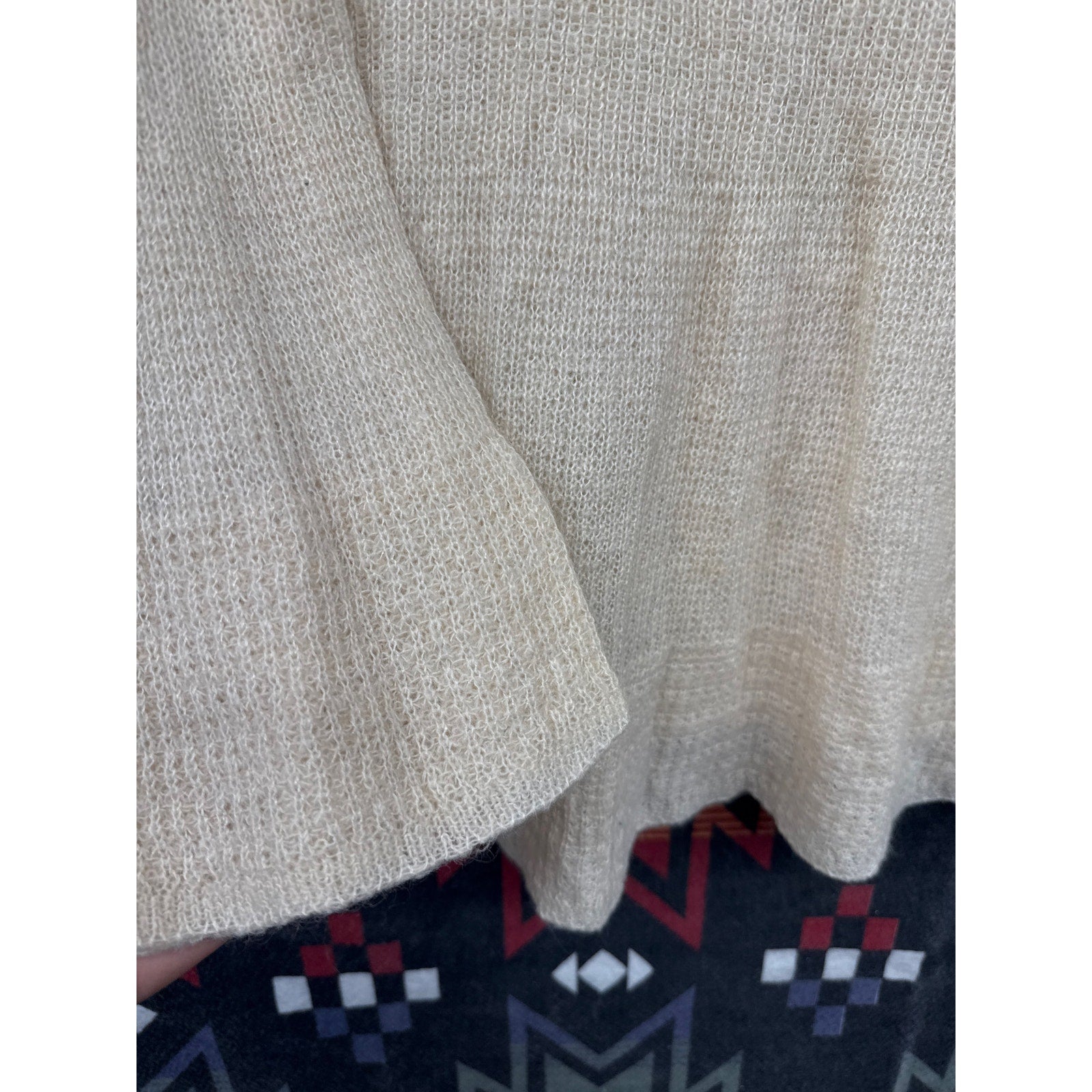 Jones New York 90s Sweater in a Cream color, featuring Trumpet Sleeves for a unique, Witchy look. This XL size sweater offers a soft, neutral tone, perfect for a quiet luxury aesthetic. Giving off Gilmore Girls vibes! Made from a blend of mohair, acrylic, and wool for ultimate comfort and style.