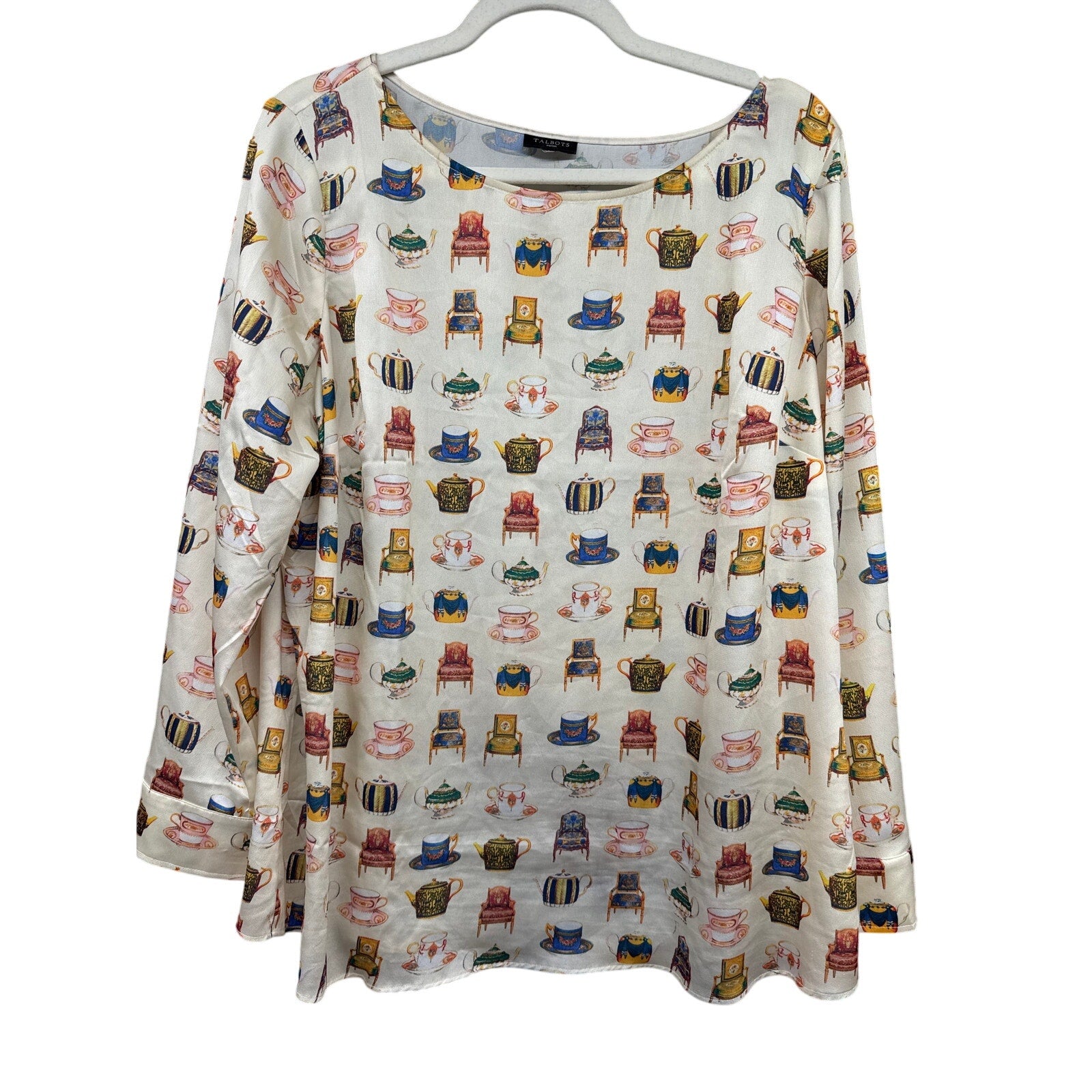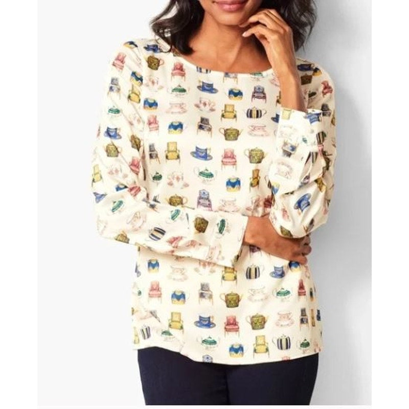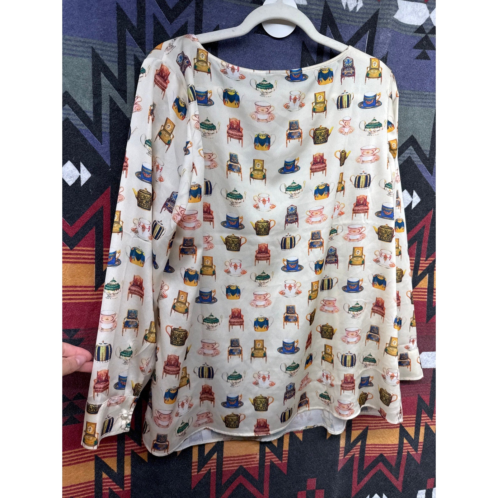 Talbots White Chairs Teacups Victorian Blouse Royal Large Novelty Print Whimsy