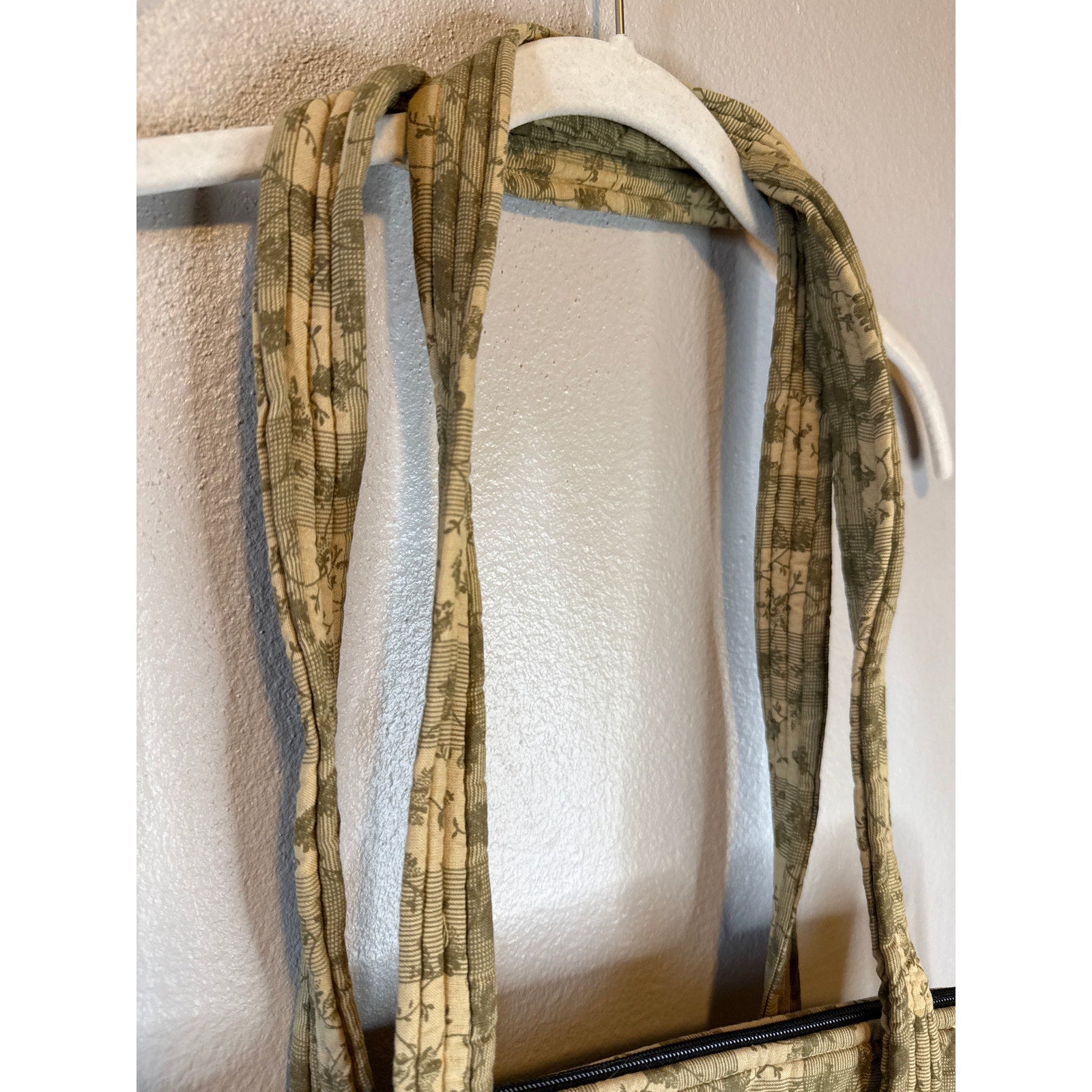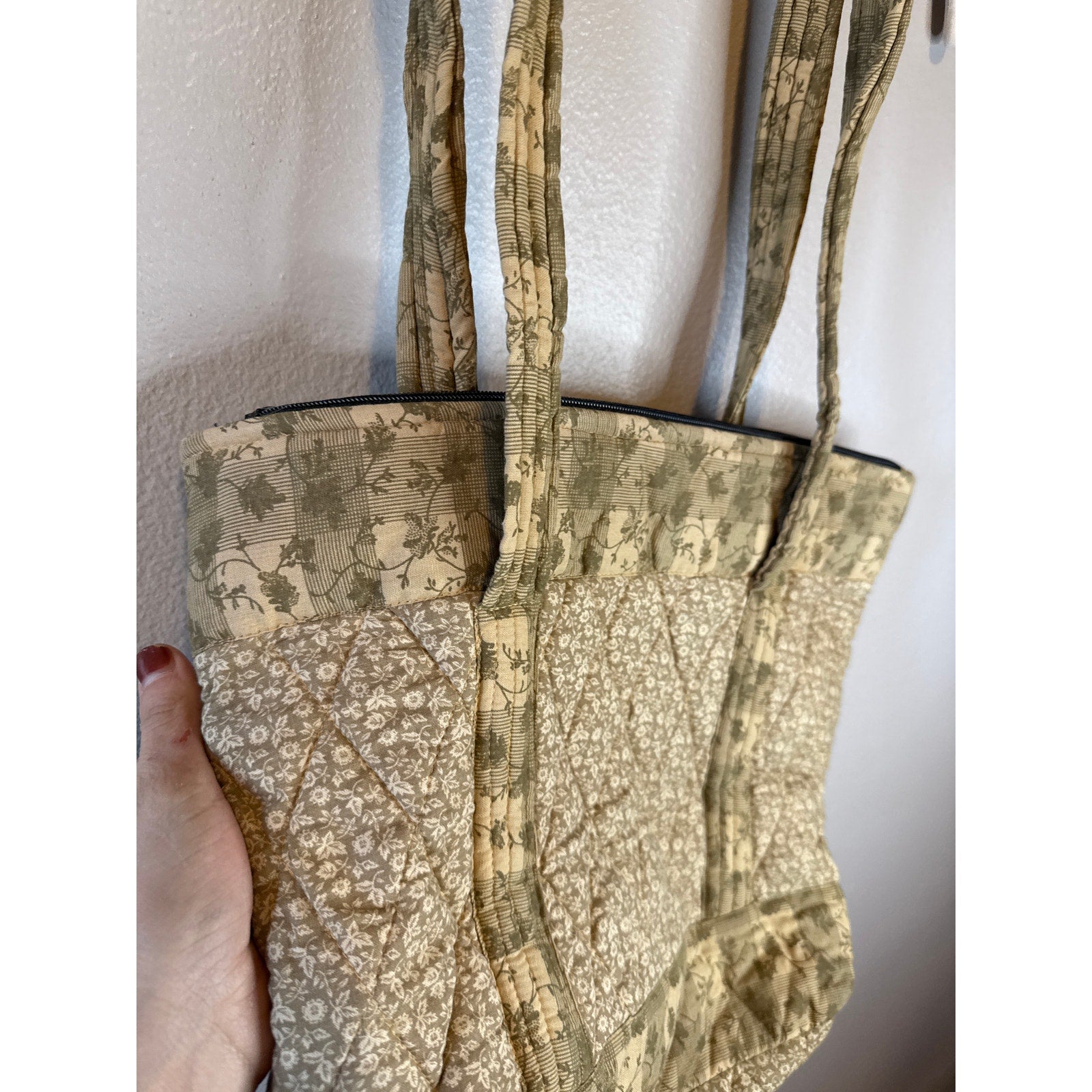 This vintage patchwork bag features a beautiful floral and nature-inspired design. The quilted texture adds a unique touch. The bag has a convenient zipper top to keep your belongings secure. This bag is in great condition and ready for a new owner.