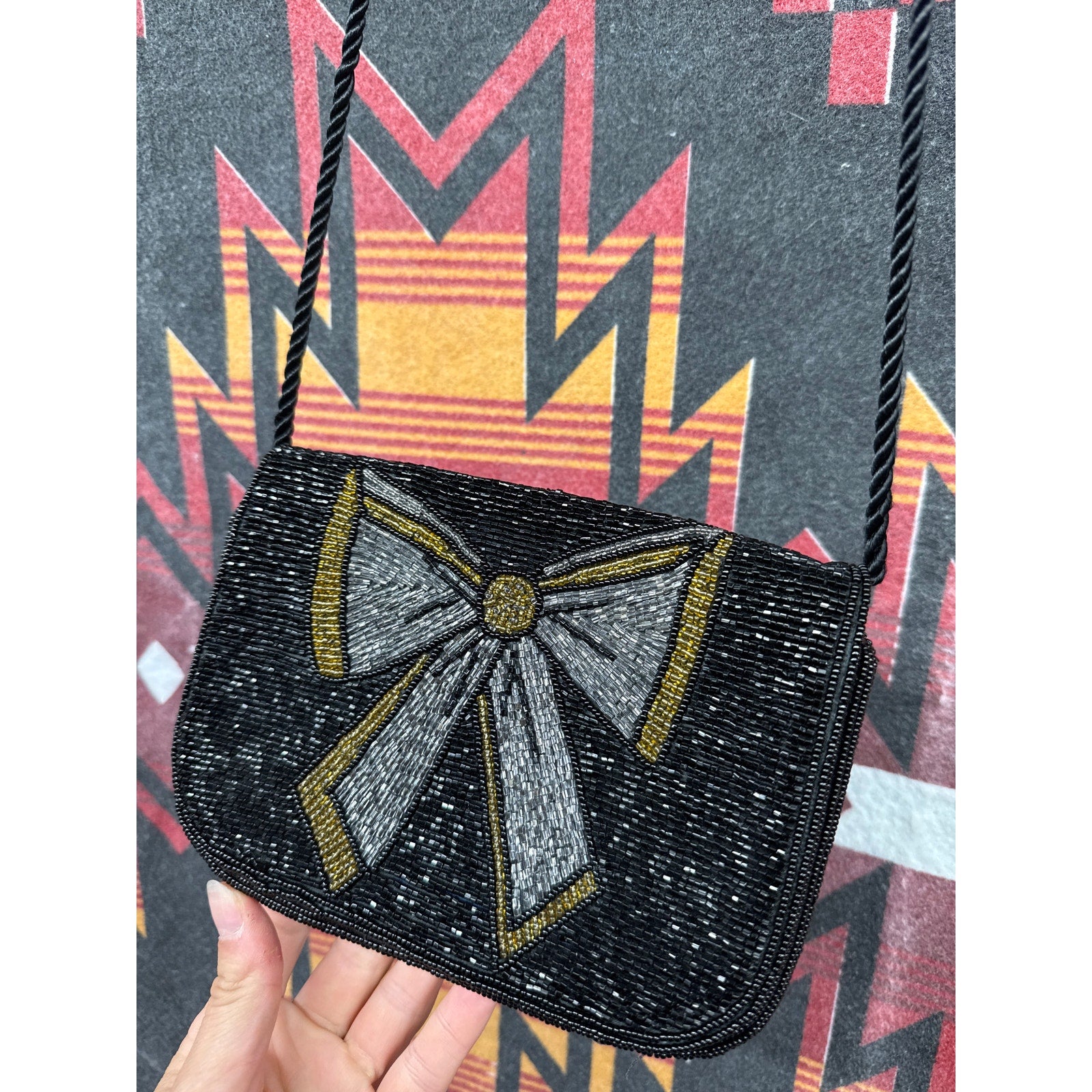 Add a touch of vintage glamour to your wardrobe with this stunning beaded purse! Perfect for a Gatsby-themed party, a formal black-tie event, or even a wedding. The elegant bow detail and shimmering gold accents make it a true statement piece.